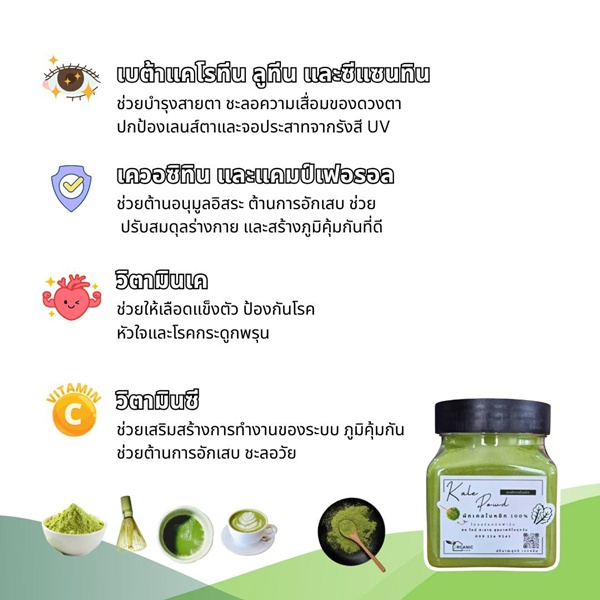 เราใช้เคลแท้ 100% ผ่านกระบวนการอบแห้งเพื่อคงรสชาติและสารอาหารที่สำคัญ เช่น วิตามิน A, C, K, B6, แคลเซียม, เหล็ก, แมกนีเซียม, โพแทสเซียม รวมถึงสารต้านอนุมูลอิสระกลุ่มแคโรทีนอยด์ (ลูทีน และ ซีแซนทีน) ที่ขึ้นชื่อเรื่องการดูแลสายตา ทั้งหมดนี้มาในรูปแบบผง ชงง่าย ละลายไว ไม่แต่งกลิ่น ไม่แต่งสี ไม่เติมแป้ง และ ไม่เติมน้ำตาล